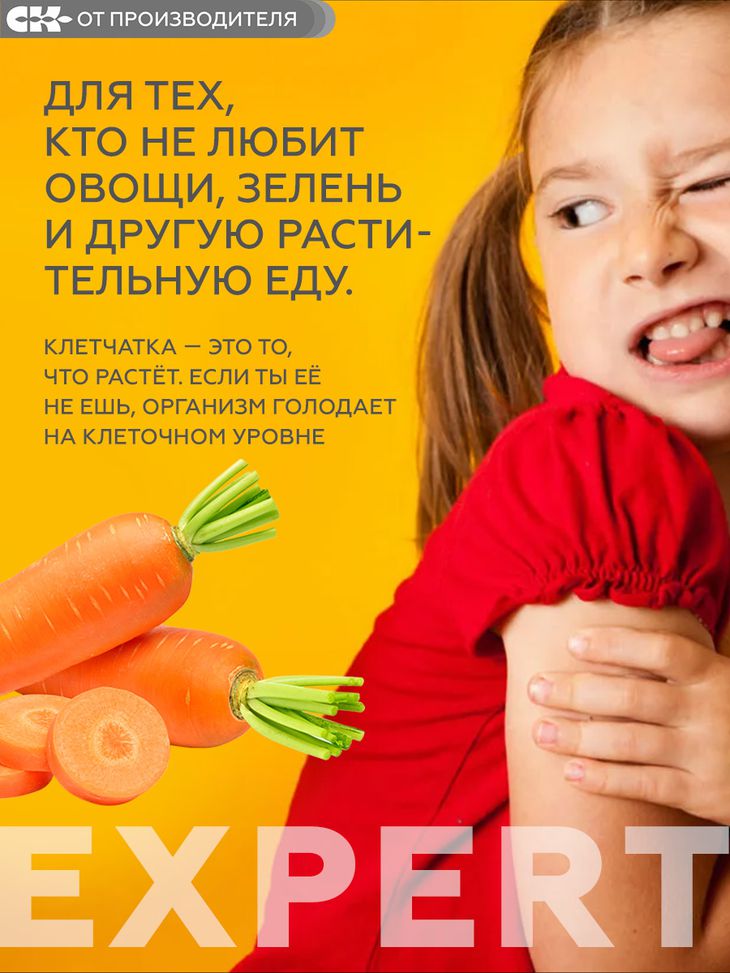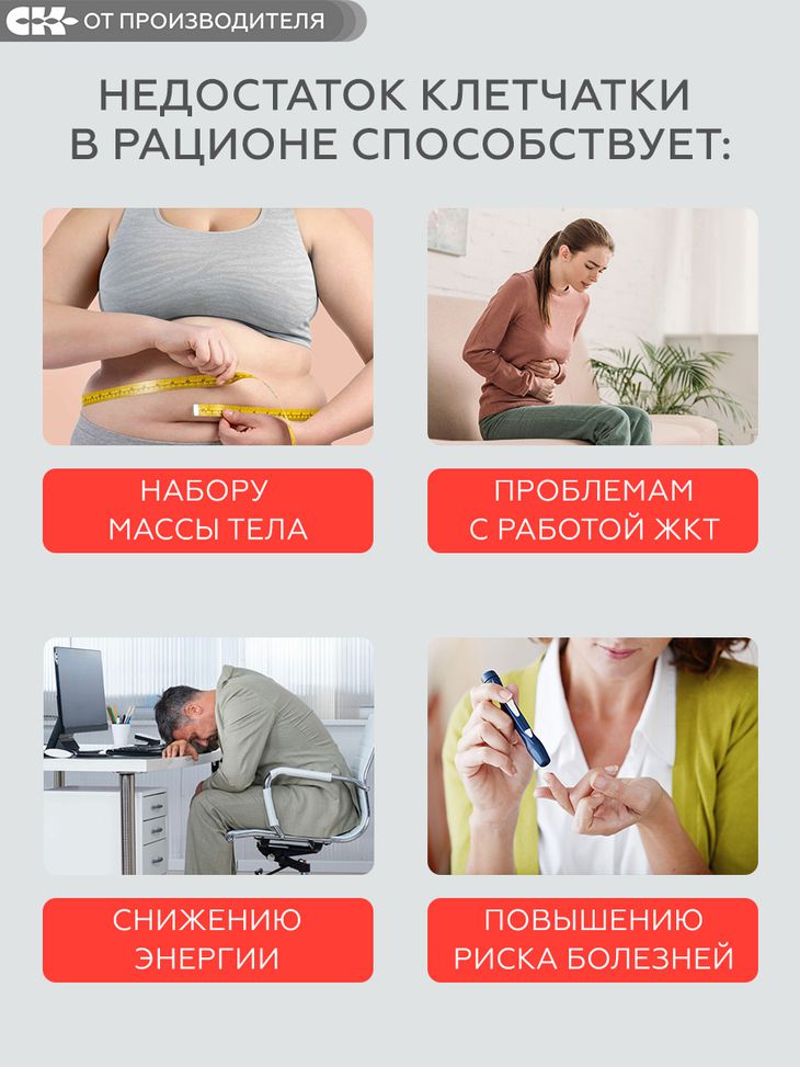 Для людей: • Следящих за балансом питания. • Восполнение овощей и фруктов в рационе питания. • Ведущих сидячий образ жизни и испытывающих недостаток движения. • Заботящихся о фигуре и внешнем виде. • Предпочитающих профилактику заболеваний с помощью природных средств. Недостаток клетчатки в рационе способствует набору веса, ухудшению внешнего вида, снижению работоспособности. Повышает риск серьёзных заболеваний. Почему в питании важен баланс двух видов клетчатки? Каждый вид клетчатки выполняет свою задачу. Соединив их, мы объединили пользу. А, выбрав правильное соотношение, — усилили эффективность действия. Нерастворимая клетчатка способствует: • Улучшению работы кишечника. • Очищению организма. Растворимая клетчатка способствует: • Контролю уровня сахара и холестерина. • Поддержке полезной микрофлоры кишечника. Как быстро ощущается эффект от приёма? При регулярном приёме коктейля у 9 человек из 10 положительный эффект наступает через 3–5 дней. Улучшается работа и очищение кишечника, появляется ощущение лёгкости, повышается настроение. Замедляется или прекращается набор веса. В течение первого месяца приёма полезное действие клетчатки нарастает, после чего сохраняется на стабильном уровне.