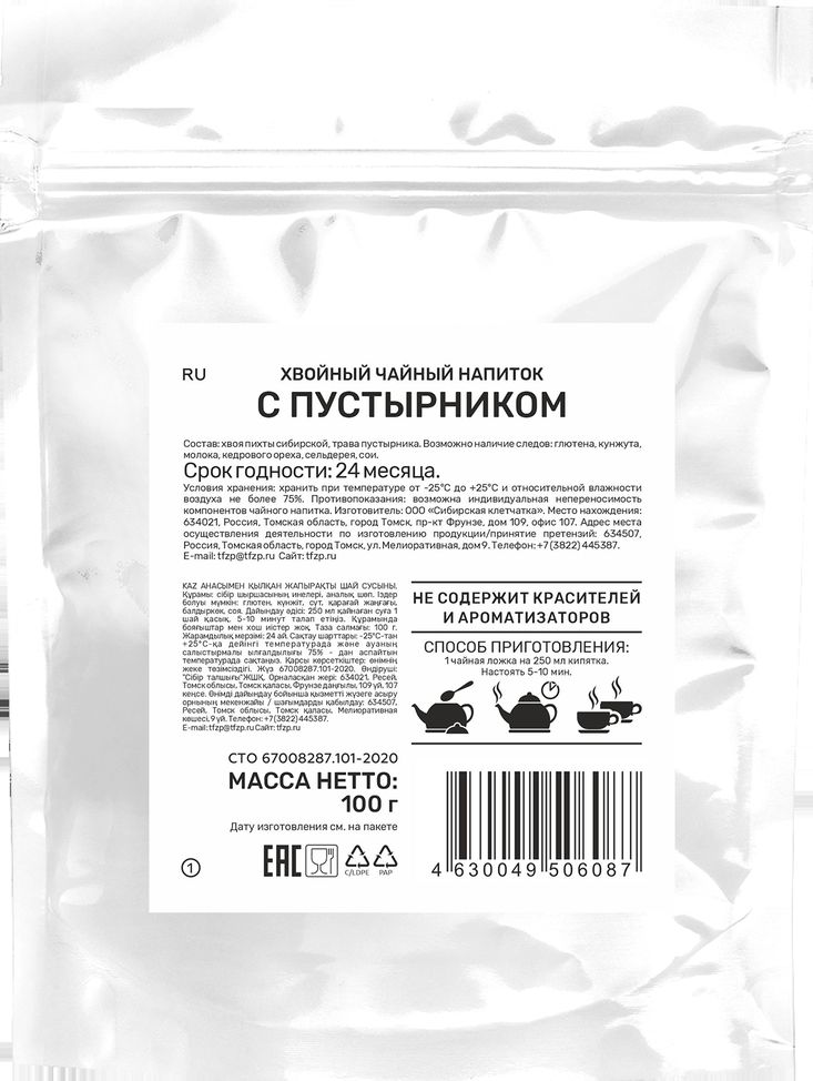 Интересный напиток с мягким хвойными нотами понравится всем мечтающим переместиться в недоступное спокойствие сибирской тайги. С сохранением тонкого аромата и вкуса хвои пихты с пустырником .